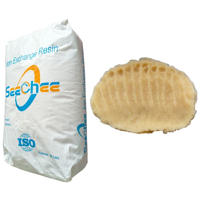 Strong acid cation resin is composed of a polystyrene matrix with a sulphonate (SO3–) functional group that is either charged with sodium ions (Na2+) for softening applications, or hydrogen ions (H+) for demineralization.